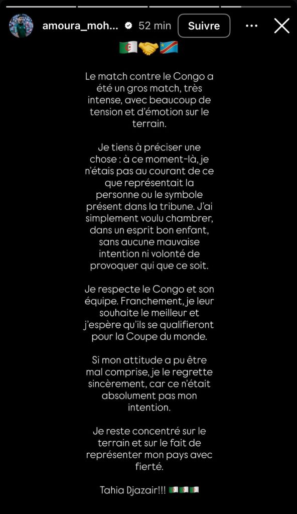 “I’m staying focused on the pitch and on representing my country with pride. Tahia Djazair!!!”