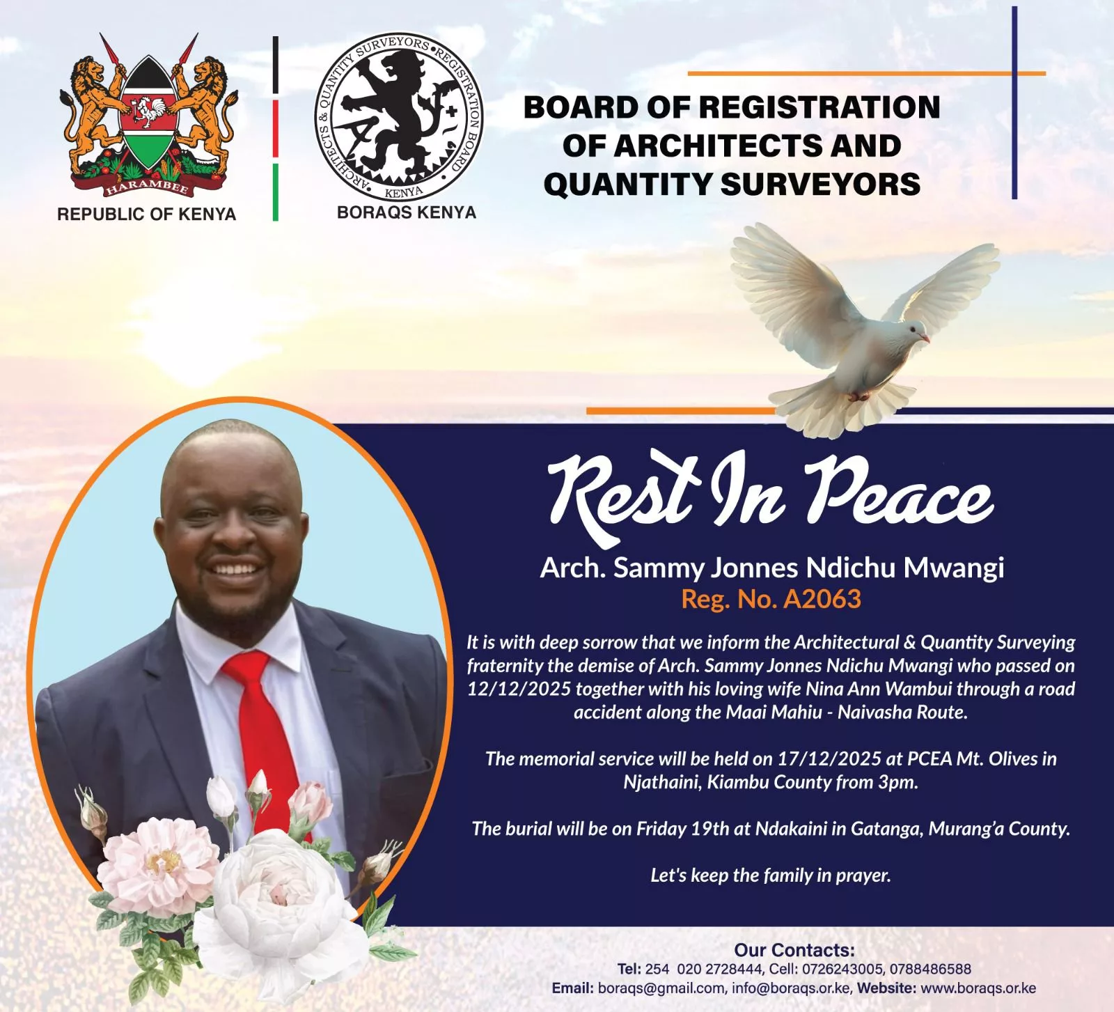 “It is with profound sadness that we announce the passing of one of our members, Arch. Sammy Jonnes Ndichu Mwangi, BORAQS Registration No. A2063, who passed on 12/12/25 in the afternoon, along with his loving wife, Nina Ann Wambui,” the post read.