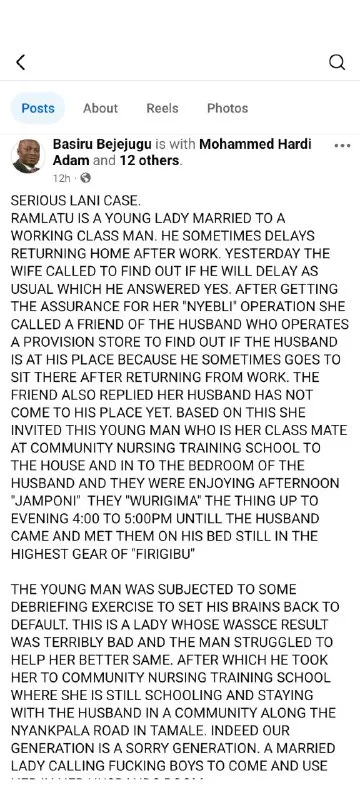 The husband of a married nursing student identified as Ramlatu has broken his silence after finding his wife in bed with her male colleague.