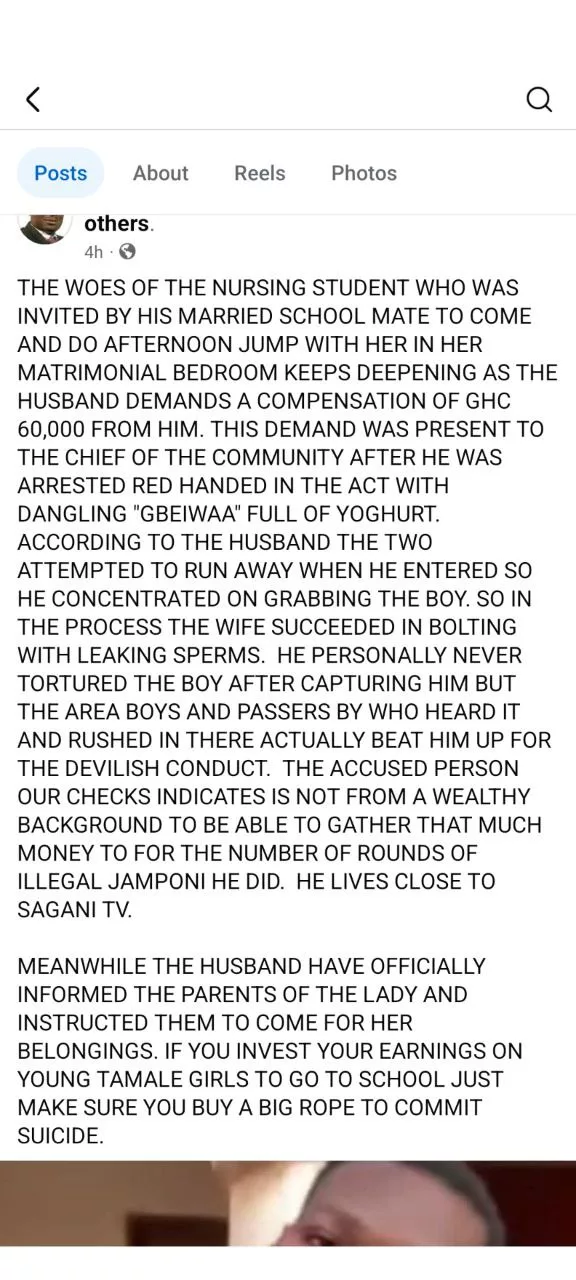 Following the incident, the husband is demanding GHS 60,000 from the male student, a request he says has been submitted to the community’s traditional authorities as compensation for the humiliation and emotional distress he claims to have suffered.