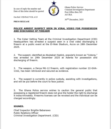 The Cyber Vetting Team at the Criminal Investigation Department (CID) Headquarters has arrested a suspect seen in a viral video discharging a firearm at a public event at the El-Wak Stadium, Accra on 28th December 2025.