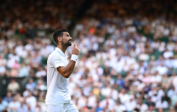 Novak Djokovic of Serbia reacts against Alexandre Muller of France during the Gentlemen’s Singles first round match on day two of The Championships Wimbledon 2025(Photo by Hannah Peters/Getty Images)