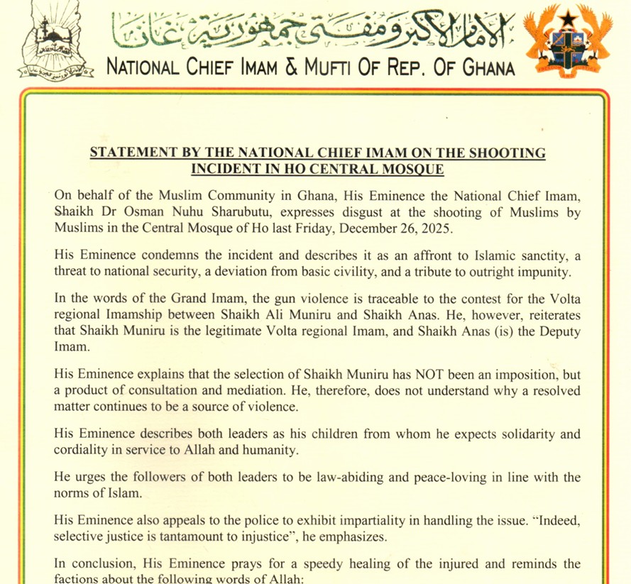 In a statement issued on Monday, December 29, and signed by the Personal Assistant to the National Chief Imam, Dr Abubakar Mohammed Marzuq Azindoo, His Eminence highlighted that the violent incident stemmed from an already settled leadership matter concerning the Volta Regional Imamship. He stressed that Shaikh Muniru remains the duly recognised Regional Imam, with Shaikh Anas serving as his Deputy.