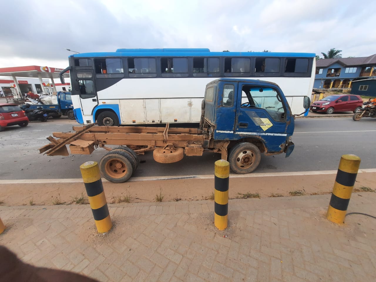 The truck was travelling from Agona Nkwanta along the Kansaworado Highway towards Accra when it reportedly lost control at Nkroful Junction after another Kia truck ahead of it suddenly veered into its lane. In an attempt to avoid a collision, the driver struck the other vehicle, veered off the road and rammed into the shops.